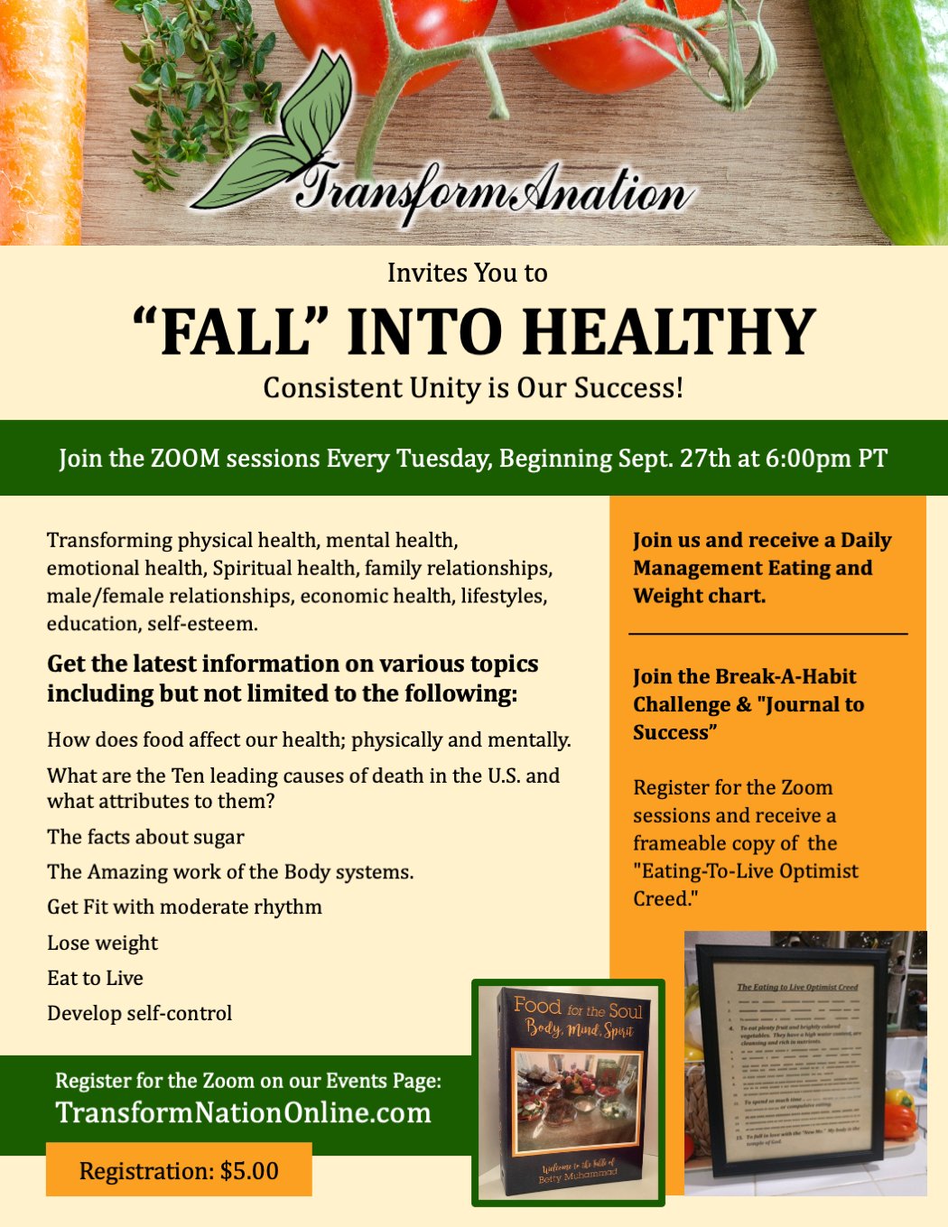 Please purchase your Registration for "Fall" Into Healthy Zoom Sessions here. After you have paid, please visit http://www.transformnationonline.com/events.html to register to receive the zoom link.